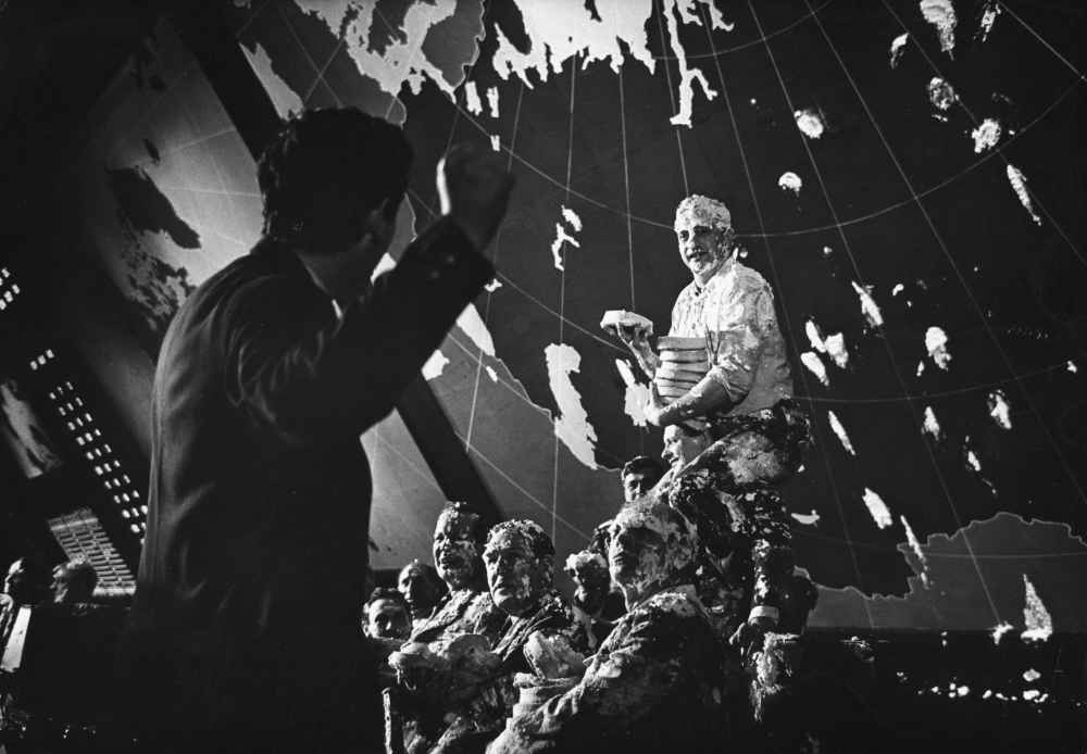 The film originally ended with a massive custard pie fight, a lovely allusion to the movies’ silent era, and an apt reductio ad absurdum of the nuclear stand-off.