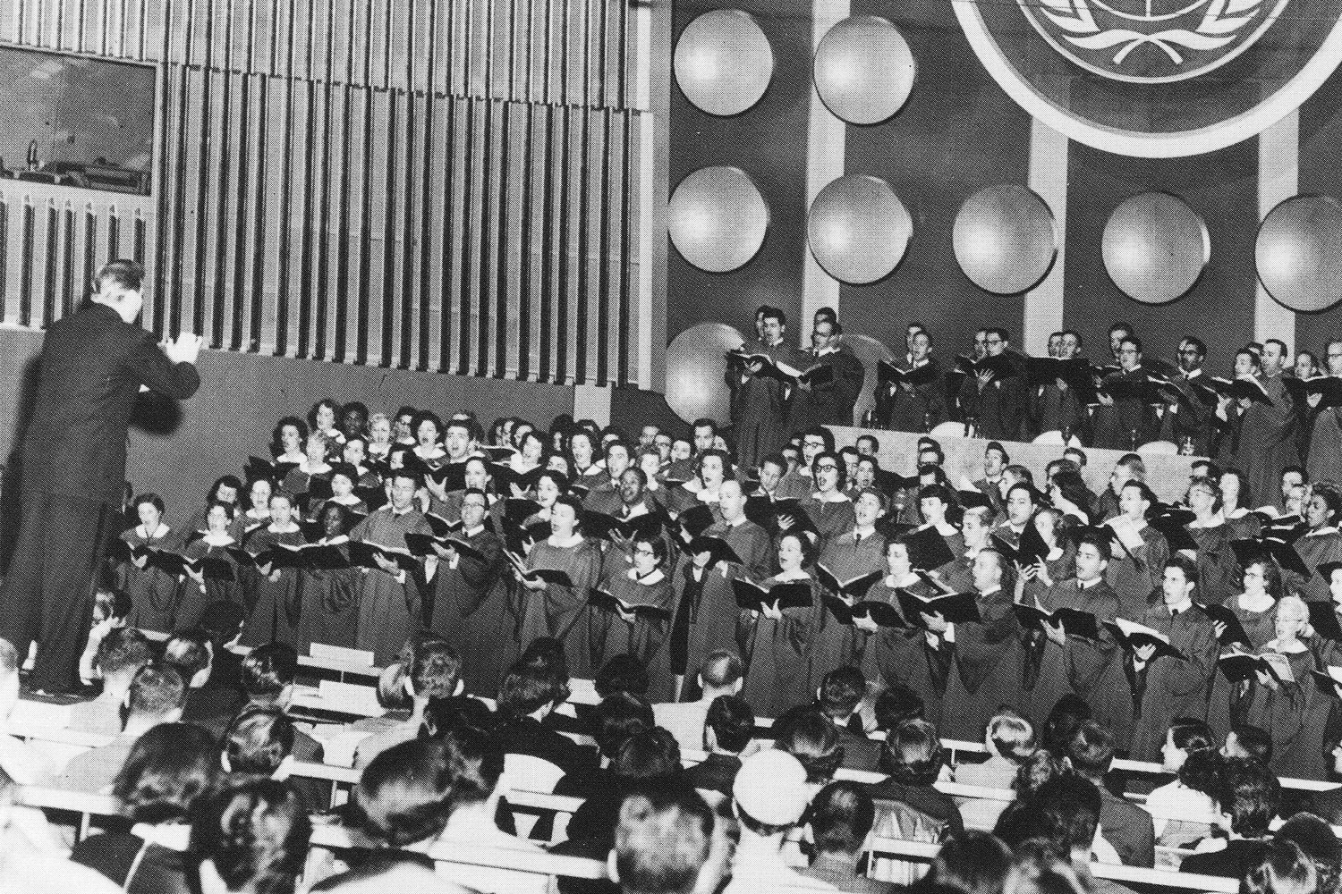 Robert Shaw conducting the New York Collegiate Chorale at opening of United Nations Building in 1953