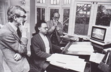 (from l. to r.) Douglas Adams, Geoffrey Perkins (producer), David Tate (Eddie etc.), Geoffrey McGivern (Ford Prefect), Mark Wing-Davey (Zaphod), Simon Jones (Arthur Dent), Alan Ford (Roosta)