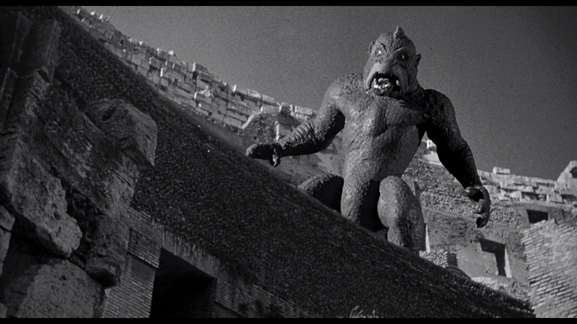 With Jones it was line drawings which, in his greatest cartoons — like the Road Runner meditations on the futility of pursuit, literal or otherwise — were given broad stroke design and crude animation (at least compared to Disney’s fantasias), yet still seemed to capture the deep absurdities and pathos of the human condition. With Harryhausen, when the black-and-white T.Rex from outer space (official name Ymir) in 20 Million Miles to Earth is gunned down by soldiers in the Colisseum, and becomes a ruin in the ruins, guess who we feel sorry for, and guess who seems more human than the humans?